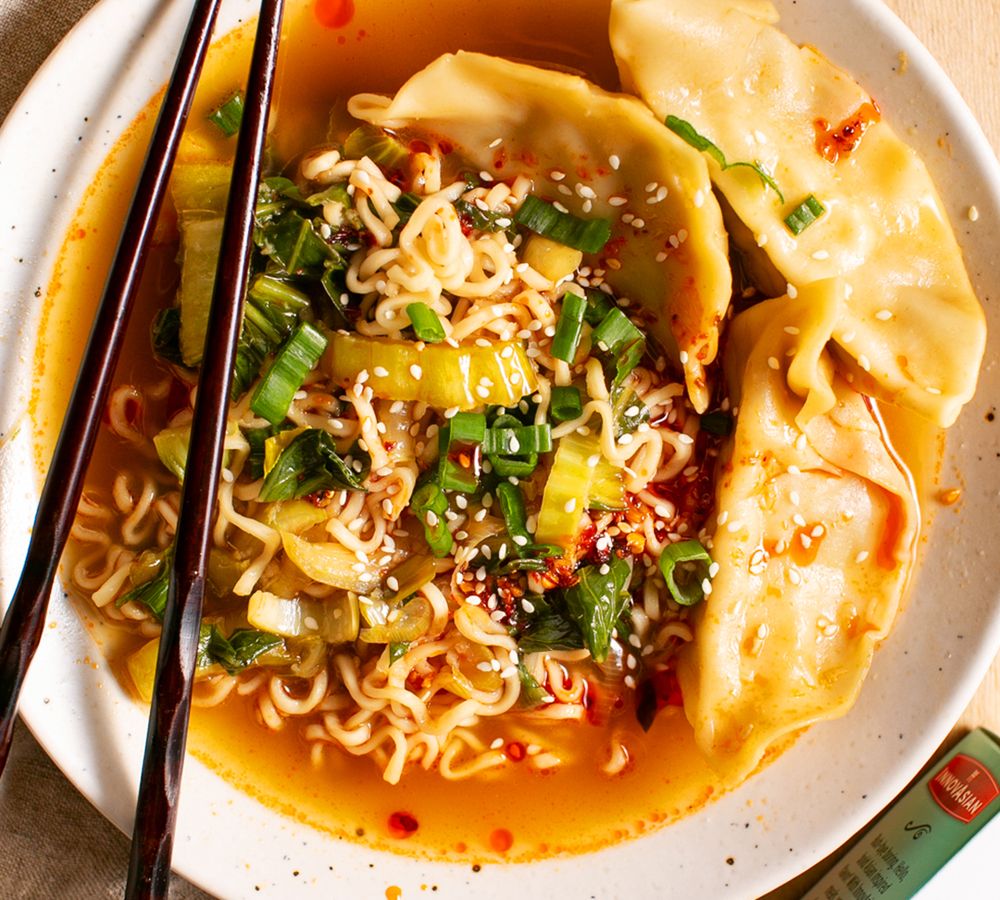 4. To serve, add ramen noodles to a bowl with the potstickers, then pour over the broth.